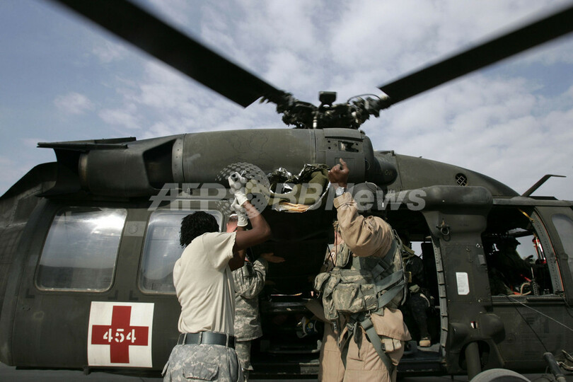 写真は北部モスル(Mosul)で24日、米軍のヘリコプターで搬送される負傷者。(c)AFP/MAURICIO LIMA