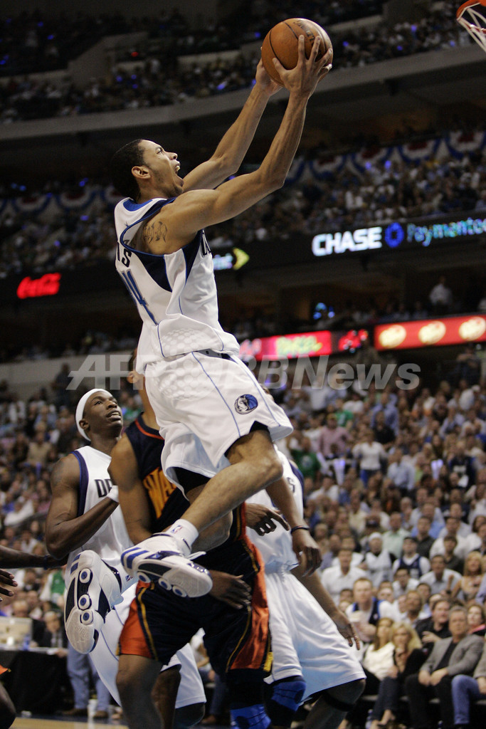 【ダラス/米国 25日 AFP】06-07NBA、西カンファレンス・プレーオフ1回戦、ダラス・マーベリックス(Dallas Mavericks)vsゴールデンステイト・ウォリアーズ(Golden State Warriors)、第2戦。マーベリックスのダーク・ノビツキー(Dirk Nowitzki)はこの試合、23得点7リバウンド2ブロックの攻守に渡る活躍でチームを牽引。試合は24のターンオーバを犯したウォリアーズが自滅する形となり、マーベリックスが112-99で勝利を収め、通算成績を1勝1敗のタイに戻した。第3戦は27日、ウォリアーズの本拠地ジ・アリーナ・イン・オークランド(The Arena in Oakland)で行なわれる。写真は、ウォリアーズのスティーブン・ジャクソン(Stephen Jackson、右)にマークされるノビツキー。(c)AFP/Getty Images Brian Bahr