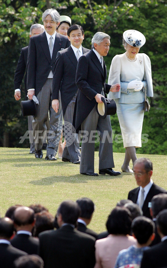 【東京 26日 AFP】東京・元赤坂の赤坂御苑で26日、天皇、皇后両陛下が主催する春の園遊会が開かれた。写真は園遊会で天皇陛下(左)と言葉を交わす小説家の瀬戸内寂聴さん(右)。(c)AFP/Shizuo Kambayashi