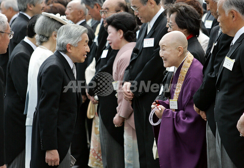 【東京 26日 AFP】東京・元赤坂の赤坂御苑で26日、天皇、皇后両陛下が主催する春の園遊会が開かれた。写真は園遊会で天皇陛下(左)と言葉を交わす小説家の瀬戸内寂聴さん(右)。(c)AFP/Shizuo Kambayashi