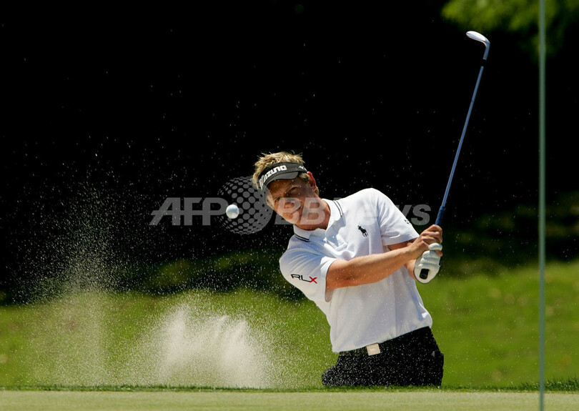 【テキサス/米国 26日 AFP】ゴルフ、米国男子ツアー第17戦・EDSバイロンネルソン選手権(EDS Byron Nelson Championship 2007)初日。米国のショーン・オヘア(Sean O’Hair)は、7バーディー、2ボギーでスコアを5アンダーとし、単独首位に立った。写真は、17番ホールでバンカーショットを放つオヘア。(c)AFP/Getty Images Stephen Dunn