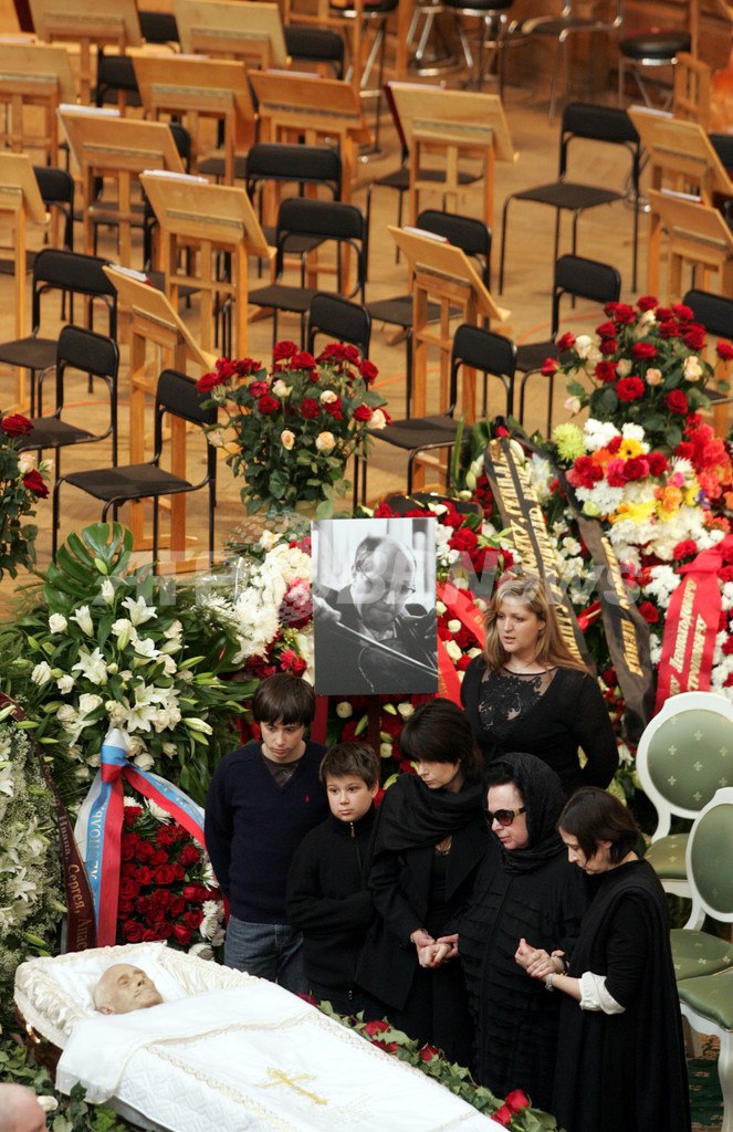 オペラ歌手のガリーナ・ビシネフスカヤ(Galina Vishnevskaya)夫人は、遺族やロストロポービッチ氏の故郷アゼルバイジャンのバクー(Baku)から駆けつけた知人らに囲まれ、棺の隣でうなだれた様子で座っていた。