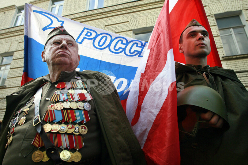 写真は28日、モスクワ(Moscow)のエストニア大使館前でエストニア政府に対して抗議する旧ソ連軍の制服を着用する退役軍人。(c)AFP/PAVEL ZELENSKY