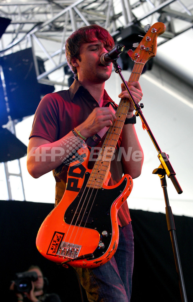 【インディオ/米国 29日 AFP】エンパイア・ポロ・フィールド(Empire Polo Field)で開催中の「コーチェラ・ミュージック・フェスティバル(Coachella Music Festival)」が28日に2日目を迎え、多くのミュージシャンが演奏を行った。写真はパフォーマンスを披露するザ・クリブス(The Cribs)のヴォーカリスト/ベーシスト、ゲイリー・ジャーマン(Gary Jarman)。(c)AFP/Getty Images Karl Walter