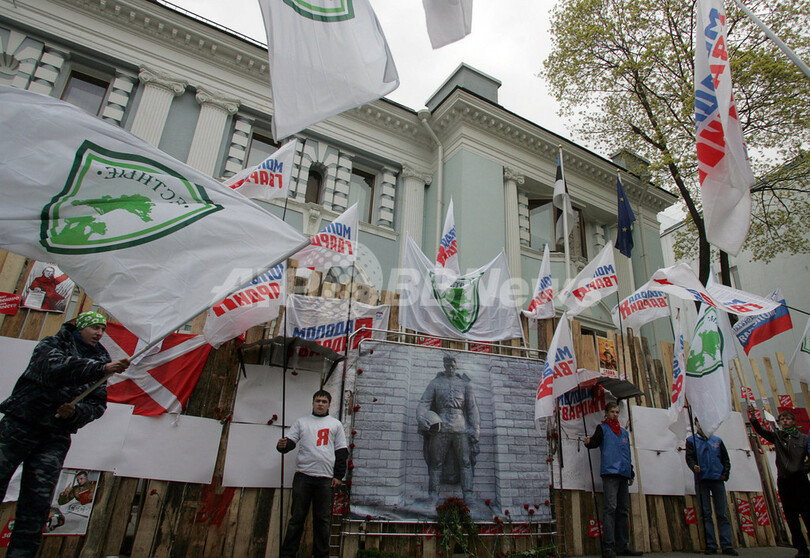 【モスクワ/ロシア 30日 AFP】エストニアが27日、同国の首都タリン(Tallinn)にある旧ソ連兵士の銅像移設を敢行したことに対し、ロシア政府は29日、これを痛烈に批判し即時制裁を求めた。今回の移設をめぐっては死者が出る暴動も発生しており、エストニア政府は、緊張緩和のために銅像を再設置する計画を迅速化させている。写真は29日、モスクワのエストニア大使館前で集会を開催する活動家たち。(c)AFP/ALEXANDER TITORENKO