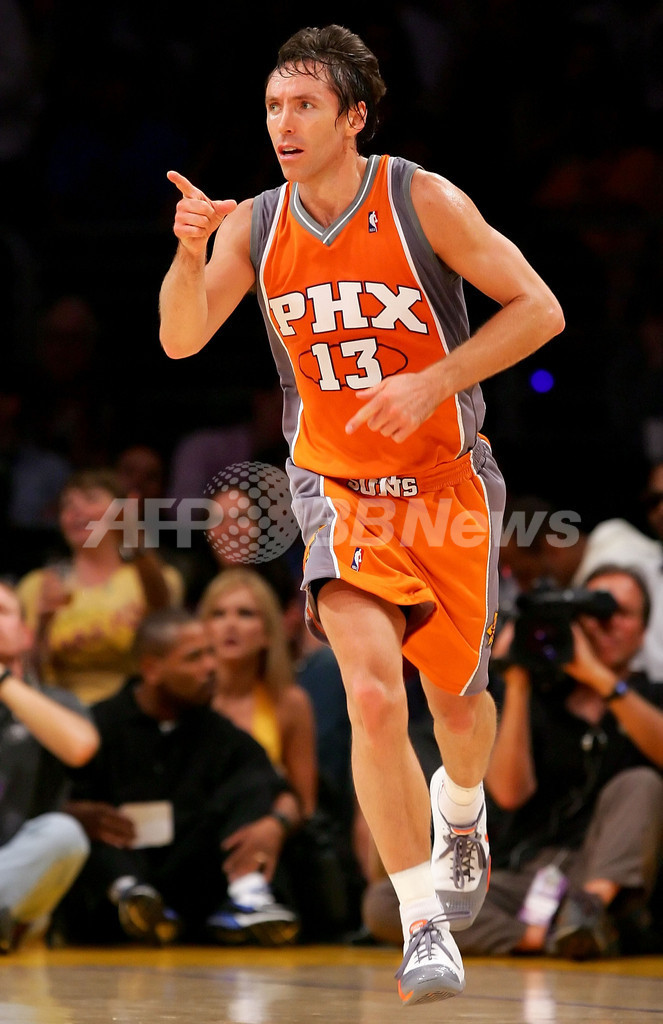 【ロサンゼルス/米国 29日 AFP】06-07NBA、西カンファレンス・プレーオフ1回戦、ロサンゼルス・レイカーズ(Los Angeles Lakers)vsフェニックス・サンズ(Phoenix Suns)、第4戦。サンズのスティーブ・ナッシュ(Steve Nash)は、レギュラーシーズンとプレーオフを通じて自己最多となる23アシストを記録するなど17得点2スティールの活躍で攻守に渡りチームを牽引し、チームの勝利に貢献。試合はレイカーズから最大20点のリードを奪ったサンズが113-100で勝利を収め、対戦成績を3勝1敗としてカンファレンス準決勝進出に王手をかけた。(c)AFP/Getty Images Lisa Blumenfeld