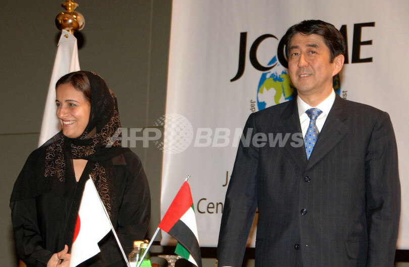 写真は29日、訪問先のアラブ首長国連邦の首都アブダビ(Abu Dhabi)でビジネスフォーラムに出席する安倍首相とルブナ・カシミ(Lubna al-Qassimi)経済相。(c)AFP