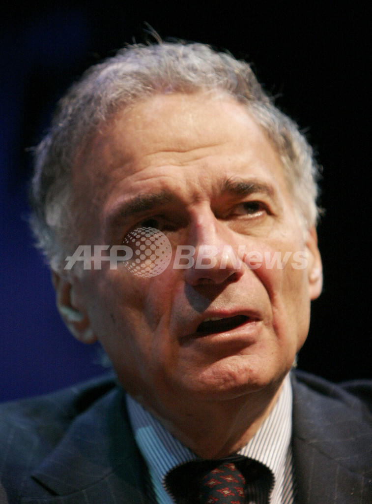 【ロサンゼルス/米国 30日 AFP】第12回ロサンゼルス・タイムズ・ブックフェスティバル(12th Annual LA Times Festival of Books)が29日に最終日を迎え、UCLAのロイス・ホール(Royce Hall)で、政治活動家のラルフ・ネイダー(Ralph Nader)氏とジャーナリストのマーク・クーパー(Marc Cooper)氏のトークイベントが行われた。写真は、トークイベントに登場したラルフ・ネイダー氏。(c)AFP/Getty Images Charley Gallay