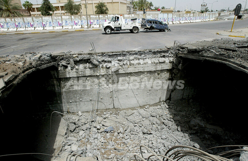 写真は4月30日、バグダッド市内で発生した別の爆発事件の現場で、大破した車を撤去する警察車両。(c)AFP/WISAM SAMI