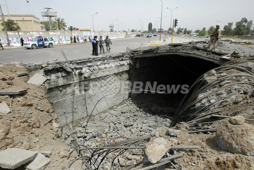 写真は4月30日、バグダッド市内で発生した別の爆発事件の現場で、大破した車を撤去する警察車両。(c)AFP/WISAM SAMI