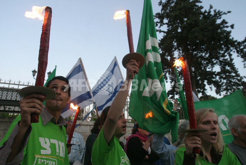 写真は4月30日、エルサレム(Jerusalem)の首相官邸前で抗議運動に参加する人々。(c)AFP