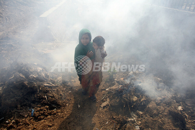 写真はパキスタンのイスラマバード(Islamabad)郊外で30日、くすぶるごみの山の中を幼児を抱いて歩く少女。(c)AFP/Farooq NAEEM