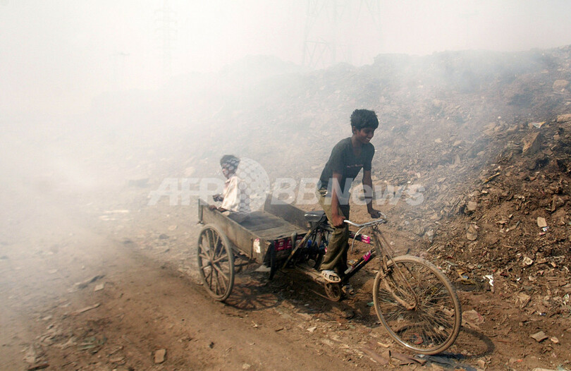 写真はパキスタンのイスラマバード(Islamabad)郊外で30日、くすぶるごみの山の中を幼児を抱いて歩く少女。(c)AFP/Farooq NAEEM