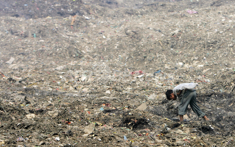 写真はパキスタンのイスラマバード(Islamabad)郊外で30日、くすぶるごみの山の中を幼児を抱いて歩く少女。(c)AFP/Farooq NAEEM