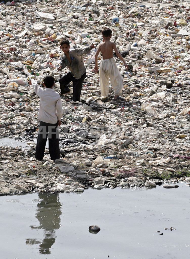 写真はパキスタンのイスラマバード(Islamabad)郊外で30日、くすぶるごみの山の中を幼児を抱いて歩く少女。(c)AFP/Farooq NAEEM