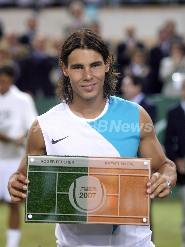 【パルマ・デ・マジョルカ/スペイン 2日 AFP】男子テニス世界ランキング2位でクレーコート72連勝中のラファエル・ナダル(Rafael Nadal、スペイン)と、同ランク1位で芝コート48連勝中のロジャー・フェデラー(Roger Federer、スイス)は、クレーと芝が半面ずつのコートによるエキシビションマッチ「The Battle of the Surfaces」で対戦し、ナダルがセットカウント2-1(7-5、4-6、7-6)でフェデラーから勝利を収めた。