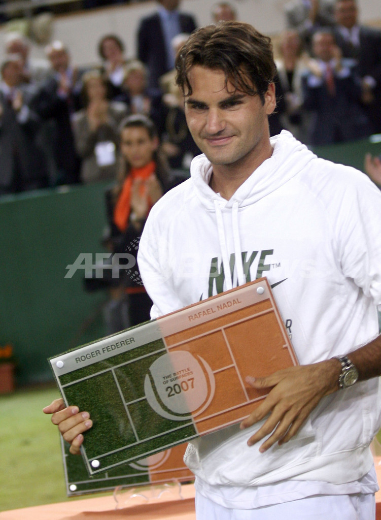 【パルマ・デ・マジョルカ/スペイン 2日 AFP】男子テニス世界ランキング2位でクレーコート72連勝中のラファエル・ナダル(Rafael Nadal、スペイン)と、同ランク1位で芝コート48連勝中のロジャー・フェデラー(Roger Federer、スイス)は、クレーと芝が半面ずつのコートによるエキシビションマッチ「The Battle of the Surfaces」で対戦し、ナダルがセットカウント2-1(7-5、4-6、7-6)でフェデラーから勝利を収めた。