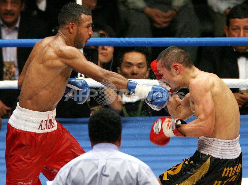 【東京 3日 AFP】ボクシング、WBA世界スーパーフライ級タイトルマッチ、王者・名城信男(Nobuo Nashiro、日本、左)は、挑戦者のアレクサンデル・ムニョス(Alexander Munoz、ベネズエラ)と対戦。試合は12ラウンドの末、名城が0-3(112-117、111-117、109-118)の判定で敗れ、2度目の防衛は成らず、王座を奪われてしまった。(c)AFP/TOSHIFUMI KITAMURA