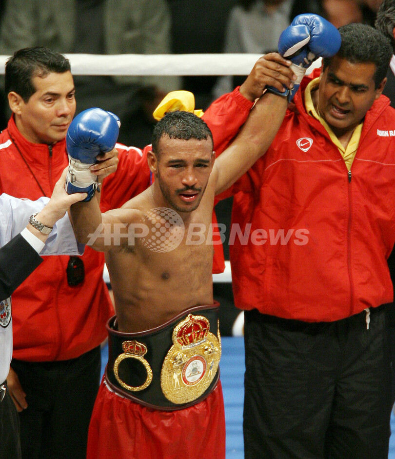 【東京 3日 AFP】ボクシング、WBA世界スーパーフライ級タイトルマッチ、名城信男(Nobuo Nashiro、日本)vsアレクサンデル・ムニョス(Alexander Munoz、ベネズエラ)。試合は12ラウンドの末、ムニョスが3-0(117-112、117-111、118-109)の判定勝利を収め、王座奪取に成功した。写真は、ベルトを身につけて勝利を喜ぶムニョス。(c)AFP/TOSHIFUMI KITAMURA