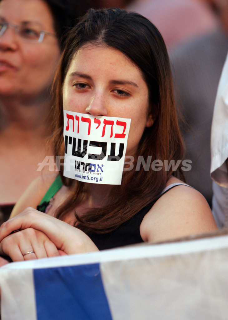 【テルアビブ/イスラエル 4日 AFP】テルアビブ(Tel-Aviv)のラビン広場(Rabin Square)で3日、エフド・オルメルト(Ehud Olmert)首相とアミール・ペレツ(Amir Peretz)国防相の辞任を求める大規模なデモが行われた。オルメルト首相は、レバノン進攻に関する政府調査委員会の中間報告を受け、自身が党首を務めるカディマ(Kadima)党内から上がった辞任要求を退けたが、今度はデモ参加者や憤慨する議員たちとの新たな戦いに直面した。写真は3日、ラビン広場でデモに参加する女性。(c)AFP/JACK GUEZ