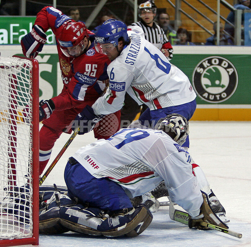【モスクワ/ロシア 4日 AFP】アイスホッケー、世界選手権大会(2007 IIHF World Championship)、2次ラウンド・グループE、ロシアvsイタリア。ロシアのアレクサンダー・フロロフ(Alexander Frolov)は、第3ピリオド13分35秒にチーム2点目を決め勝利に貢献した。試合はロシアが3-0でイタリアを破り3連勝を飾った。(c)AFP/JANEK SKARZYNSKI