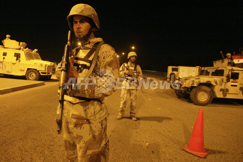 写真は同日、夜間外出禁止時間直前にバグダッドの検問所で警備に当たるイラク人兵士たち。(c)AFP/ALI YUSSEF