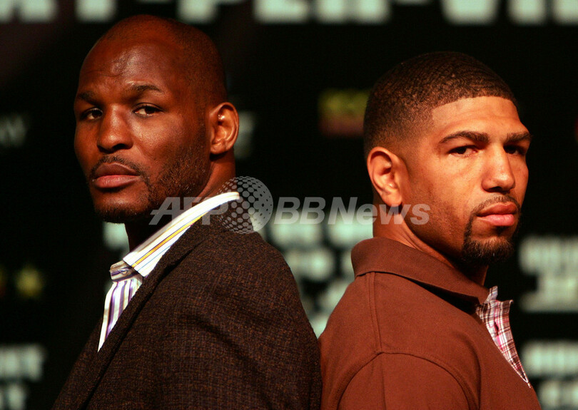 【ラスベガス/米国 5日 AFP】ラスベガスのMGMグランド・ホテル&カジノ(MGM Grand Hotel/Casino)での復帰戦を7月21日に控えたバーナード・ホプキンス(Bernard Hopkins、米国)は、対戦相手のロナルド・ウィンキー・ライト(Ronald Winky Wright、米国)と共に記者会見に出席した。写真は、カメラの前でポーズを取るホプキンス(左)とライト。(c)AFP/Getty Images Jed Jacobsohn