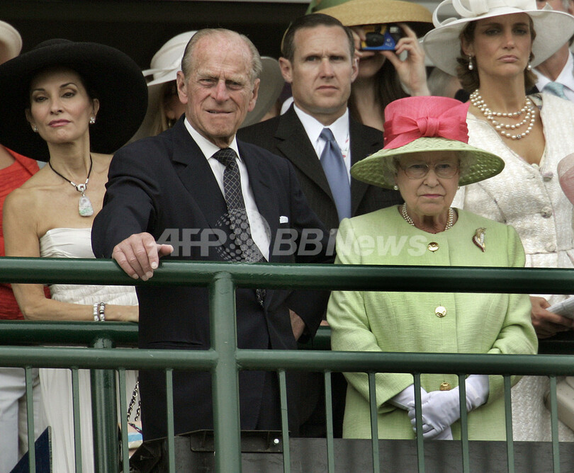 【ルイビル/米国 6日 AFP】訪米中の英国の女王エリザベス2世(Elizabeth II)は5日、ケンタッキー(Kentucky)州ルイビル(Louisville)のチャーチルダウンズ競馬場(Churchill Downs)を訪れ、第133回ケンタッキー・ダービー(Kentucky Derby)を観戦した。写真は競馬を観戦するエリザベス女王とフィリップ殿下(Prince Philip)。(c)AFP/Timothy A. CLARY