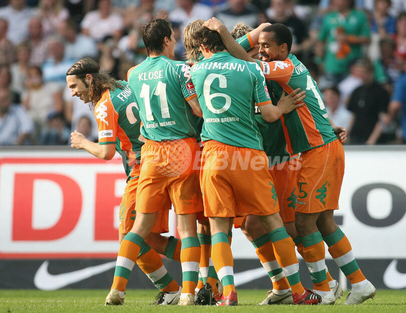 【ベルリン/ドイツ 6日 AFP】サッカー、ドイツ・ブンデスリーガ・第32節、ヘルタ・ベルリン(Hertha Berlin)vsヴェルダー・ブレーメン(Werder Bremen)。ブレーメンのマルクス・ローゼンベリ(Markus Rosenberg)は、ハットトリック(前半19分、後半5分、37分)の活躍でチームを勝利に導いた。試合はブレーメンが4-1でヘルタ・ベルリンを降して勝ち点を63に伸ばし、首位シャルケ04(Schalke04)との勝ち点差2をキープした。写真は、先制ゴールを決めアピールするローゼンベリ。(c)AFP/MARCUS BRANDT