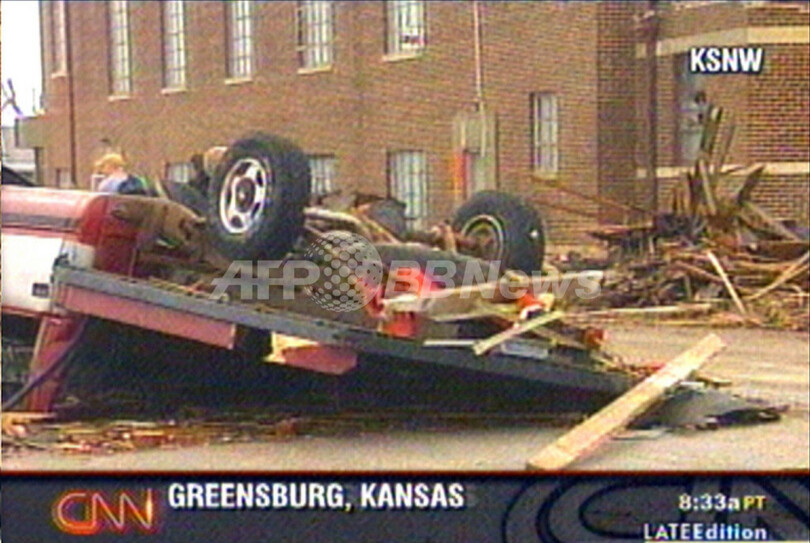 【グリーンズバーグ/米国 7日 AFP】中西部カンザス(Kansas)州を4日深夜に直撃した大規模な竜巻による死者は、少なくとも9人になった。現地では病院や住宅などに大きな被害が出ている。地元当局の発表および報道によると、竜巻に見舞われた同州グリーンズバーグ(Greensburg)で6人が死亡、さらに周辺地域で3人が死亡した。負傷者も多数発生しており、数十人が病院に搬送されている。写真は6日、CNNが放映した被災地グリーンズバーグの状況。(c)AFP/CNN