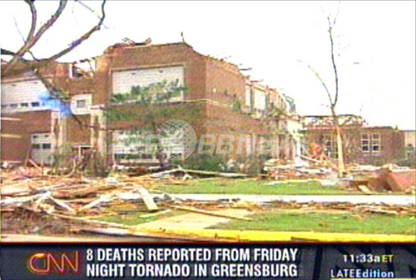 【グリーンズバーグ/米国 7日 AFP】中西部カンザス(Kansas)州を4日深夜に直撃した大規模な竜巻による死者は、少なくとも9人になった。現地では病院や住宅などに大きな被害が出ている。地元当局の発表および報道によると、竜巻に見舞われた同州グリーンズバーグ(Greensburg)で6人が死亡、さらに周辺地域で3人が死亡した。負傷者も多数発生しており、数十人が病院に搬送されている。写真は6日、CNNが放映した被災地グリーンズバーグの状況。(c)AFP/CNN