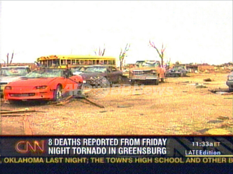【グリーンズバーグ/米国 7日 AFP】中西部カンザス(Kansas)州を4日深夜に直撃した大規模な竜巻による死者は、少なくとも9人になった。現地では病院や住宅などに大きな被害が出ている。地元当局の発表および報道によると、竜巻に見舞われた同州グリーンズバーグ(Greensburg)で6人が死亡、さらに周辺地域で3人が死亡した。負傷者も多数発生しており、数十人が病院に搬送されている。写真は6日、CNNが放映した被災地グリーンズバーグの状況。(c)AFP/CNN