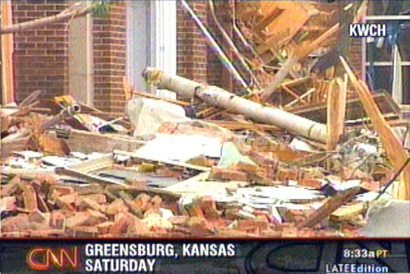 【グリーンズバーグ/米国 7日 AFP】中西部カンザス(Kansas)州を4日深夜に直撃した大規模な竜巻による死者は、少なくとも9人になった。現地では病院や住宅などに大きな被害が出ている。地元当局の発表および報道によると、竜巻に見舞われた同州グリーンズバーグ(Greensburg)で6人が死亡、さらに周辺地域で3人が死亡した。負傷者も多数発生しており、数十人が病院に搬送されている。写真は6日、CNNが放映した被災地グリーンズバーグの状況。(c)AFP/CNN