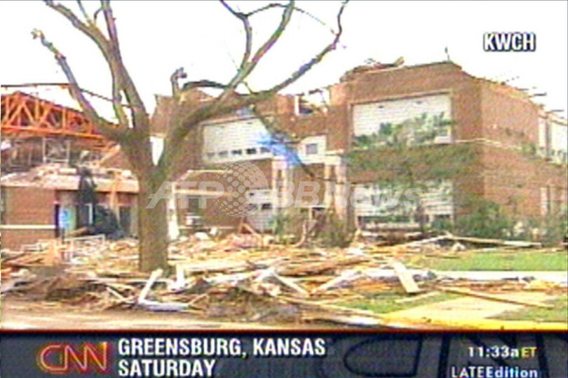 【グリーンズバーグ/米国 7日 AFP】中西部カンザス(Kansas)州を4日深夜に直撃した大規模な竜巻による死者は、少なくとも9人になった。現地では病院や住宅などに大きな被害が出ている。地元当局の発表および報道によると、竜巻に見舞われた同州グリーンズバーグ(Greensburg)で6人が死亡、さらに周辺地域で3人が死亡した。負傷者も多数発生しており、数十人が病院に搬送されている。写真は6日、CNNが放映した被災地グリーンズバーグの状況。(c)AFP/CNN
