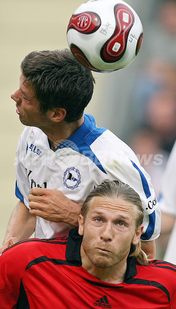 【レバークーゼン/ドイツ 6日 AFP】サッカー、ドイツ・ブンデスリーガ、第32節、レバークーゼン(Leverkusen)vsアルミニア・ビーレフェルト(Arminia Bielefeld)。試合はビーレフェルトが2-1でレバークーゼンを降し、3連勝を飾りシーズン10勝目を挙げた。写真は、レバークーゼンのカリム・ハグイ(Karim Haggui、右)とヘディングで競り合うビーレフェルトのクリスティアン・アイグラー(Christian Eigler)。(c)AFP/DDP/PATRIK STOLLARZ