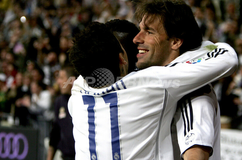【マドリード/スペイン 6日 AFP】サッカー、スペイン・リーガエスパニョーラ1部・第33節、レアル・マドリード(Real Madrid)vsセビージャ(Sevilla)。レアル・マドリードのルート・ファン・ニステルローイ(Ruud Van Nistelrooy)は、2ゴール(後半18分、40分)を挙げる活躍でチームの勝利に貢献した。試合はレアル・マドリードが3-2でセビージャに競り勝ち、リーグ3連勝を飾り勝ち点を63に伸ばし、レアル・マドリードはセビージャを抜き2位につけた。写真は、自身2点目のゴールを決めてチームメイトから祝福を受けるファン・ニステルローイ(右)。(c)AFP/BRU GARCIA