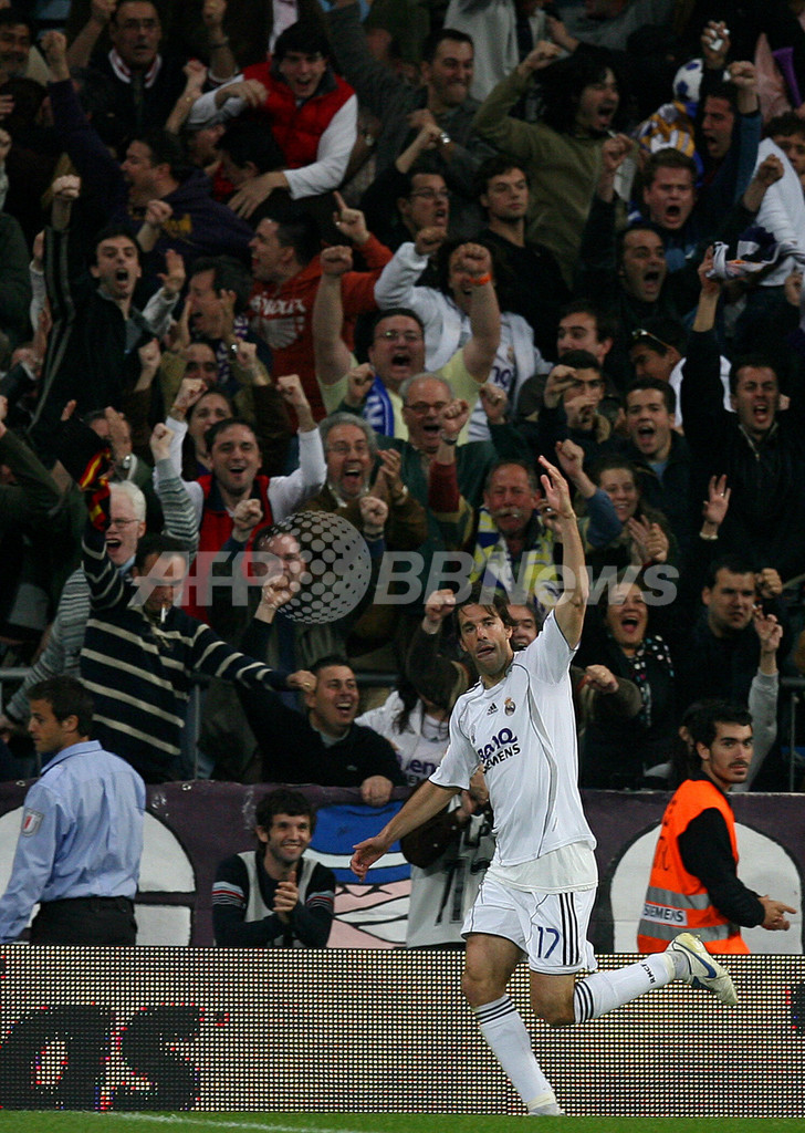 【マドリード/スペイン 6日 AFP】サッカー、スペイン・リーガエスパニョーラ1部・第33節、レアル・マドリード(Real Madrid)vsセビージャ(Sevilla)。レアル・マドリードのルート・ファン・ニステルローイ(Ruud Van Nistelrooy)は、2ゴール(後半18分、40分)を挙げる活躍でチームの勝利に貢献した。試合はレアル・マドリードが3-2でセビージャに競り勝ち、リーグ3連勝を飾り勝ち点を63に伸ばし、レアル・マドリードはセビージャを抜き2位につけた。写真は、自身2点目のゴールを決めてチームメイトから祝福を受けるファン・ニステルローイ(右)。(c)AFP/BRU GARCIA