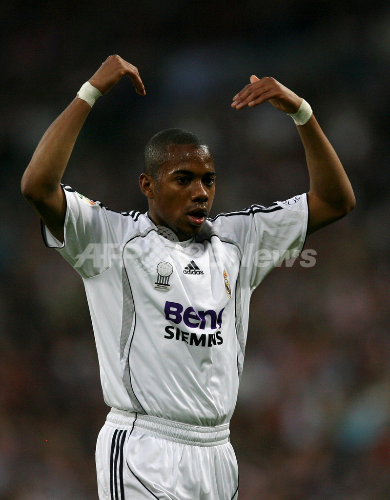 【マドリード/スペイン 6日 AFP】サッカー、スペイン・リーガエスパニョーラ1部・第33節、レアル・マドリード(Real Madrid)vsセビージャ(Sevilla)。レアル・マドリードのルート・ファン・ニステルローイ(Ruud Van Nistelrooy)は、2ゴール(後半18分、40分)を挙げる活躍でチームの勝利に貢献した。試合はレアル・マドリードが3-2でセビージャに競り勝ち、リーグ3連勝を飾り勝ち点を63に伸ばし、レアル・マドリードはセビージャを抜き2位につけた。写真は、自身2点目のゴールを決めてチームメイトから祝福を受けるファン・ニステルローイ(右)。(c)AFP/BRU GARCIA