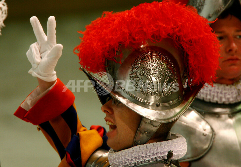 【バチカン 7日 AFP】ローマ法王を護衛するスイス衛兵隊(Swiss guard)がバチカンで6日、新兵38人の宣誓式が行われた。世界最小の軍隊の記念すべき501周年目の宣誓式となった。6日は、1527年に神聖ローマ帝国軍による『ローマ略奪』の時、法王クレメンス7世(Clement VII)を守って189人中147人が命を落とした日にあたる。写真は同日、ローマ法王ベネディクト16世(Benedict XVI)に対して忠誠を誓う新入隊員。(c)AFP/Vincenzo PINTO