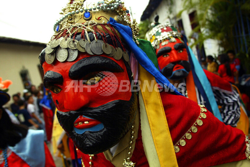【サンサルバドル/エルサルバドル 7日 AFP】首都サンサルバドル(San Salvador)から20キロ郊外のPanchimalcoで6日、聖母マリア(Virgin Mary)をまつって豊作を祈る「Festival of Palms and Flowers(しゅろと花の祭り)」が開かれた。写真は、スペイン人とアラブ人の闘いを伝統舞踊で再現するパフォーマンス・グループ「The Historians」。(c)AFP/Jose CABEZAS