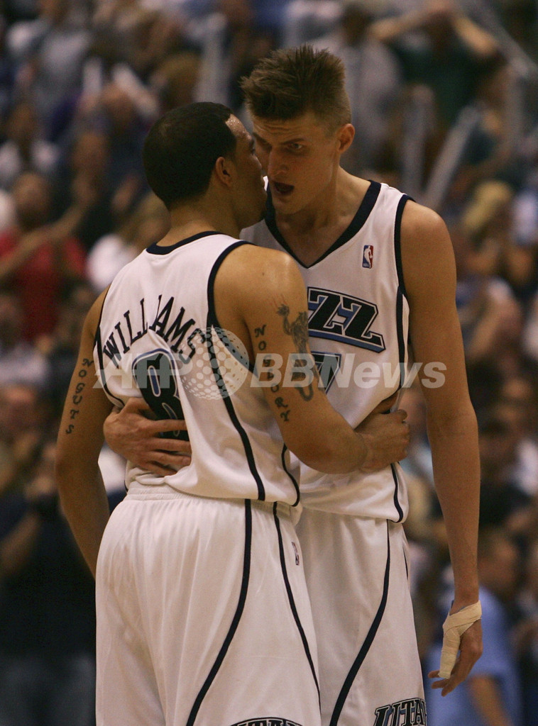 【ソルトレイクシティー/米国 7日 AFP】06-07NBA、西カンファレンス・準決勝、ユタ・ジャズ(Utah Jazz)vsゴールデンステイト・ウォリアーズ(Golden State Warriors)、第1戦。ジャズのデロン・ウィリアムス(Deron Williams)は、ゲーム最多の31得点を挙げる活躍でチームの勝利に貢献。試合はジャズが116-112でウォリアーズを降し、初戦を白星で飾った。写真は、ウォリアーズのスティーブン・ジャクソン(Stephen Jackson)の上からレイアップシュートを放つウィリアムス。(c)AFP/Getty Images Harry How