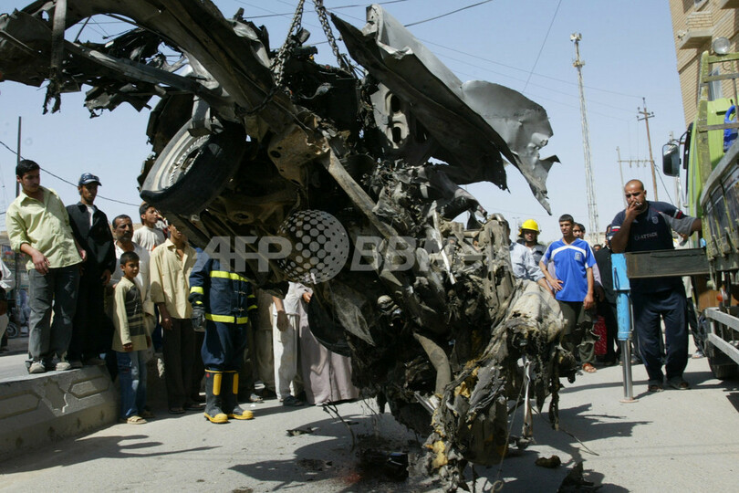 写真は、現場から運び出される車両爆弾の残骸。(c)AFP/QASSEM ZEIN