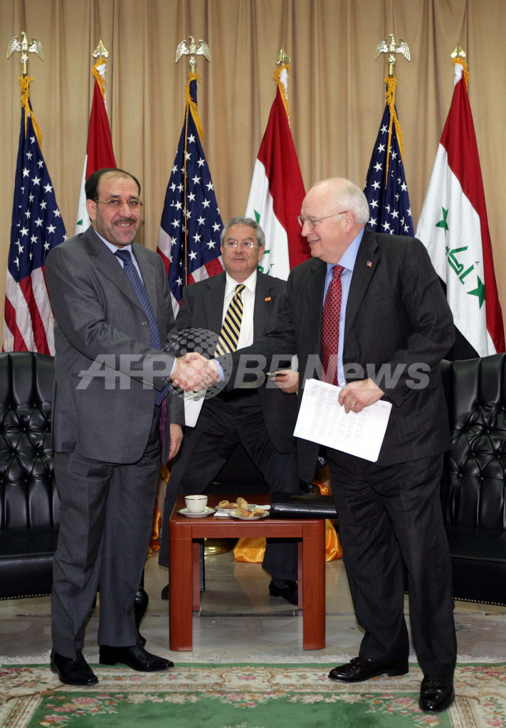 写真は同日、握手するチェイニー米副大統領(右)とマリキ首相。(c)AFP/IRAQI PRIME MINISTER'S OFFICE