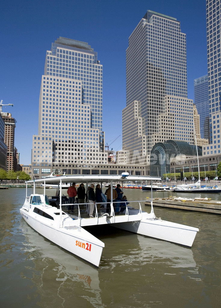 【ニューヨーク 11日 AFP】ソーラーボートによる史上初の大西洋横断を目指して、スイスから出発した「サン21(Sun21)」号が8日、目的地のニューヨークに到着した。この計画を実現させた有志グループ「トランスアトランティック21(Transatlantic21)」は、ギネスブック(Guinness Book)への登録も狙っていたが、最大の目的は「外洋航海を成功させ、ソーラーエネルギーの可能性を示すこと」だったという。サン21号は2006年10月16日にスイス北部のバーゼル(Basel)を出港していた。写真は8日、ニューヨークのマンハッタン(Manhattan)島に近づくサン21号。(c)AFP/TRANSATLANTIC21/DYLAN CROSS