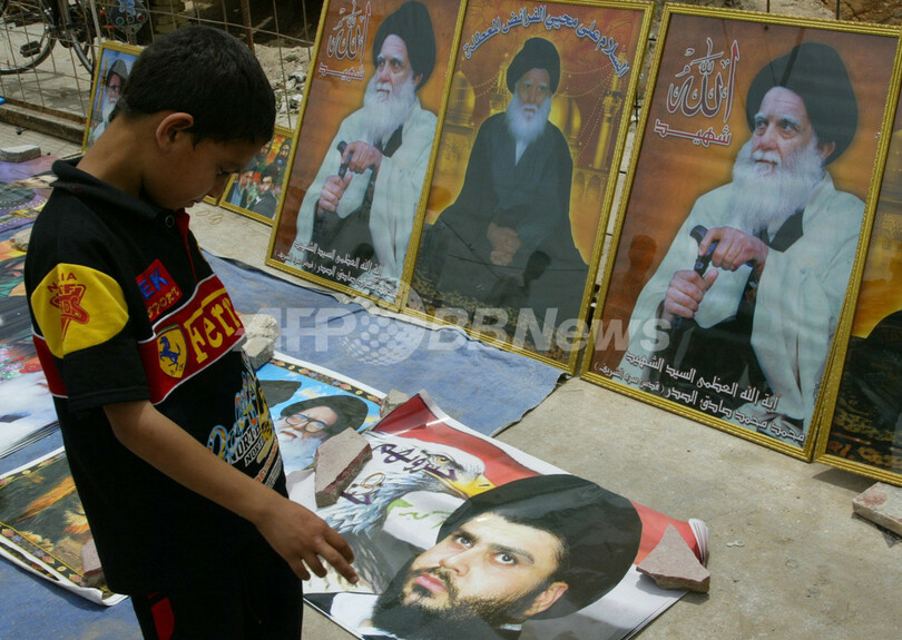 写真は同日、南部ナジャフ(Najaf)のクーファ(Kufa)でサドル師のポスターを眺める少年。(c)AFP/QASSEM ZEIN