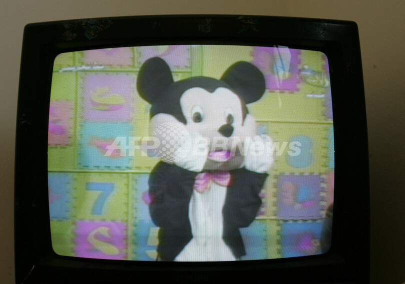 【エルサレム/イスラエル 12日 AFP】イスラム原理主義組織ハマス(Hamas)のテレビ局「アルアクサ・テレビ(Al-Aqsa television)」が、ミッキーマウス(Mickey Mouse)に酷似したキャラクターを用いてイスラエルなどへの抵抗を呼び掛けており、イスラエル首相府やユダヤ人グループがこれを強く非難している。問題となっている番組は、ハマスが放送する子供向け番組で「ファルフル(Farfur)」との名前が付けられたキャラクターと少女がイスラエルや米国への抵抗を呼びかける。写真は11日、放映された番組。(c)AFP/MOHAMMED ABED
