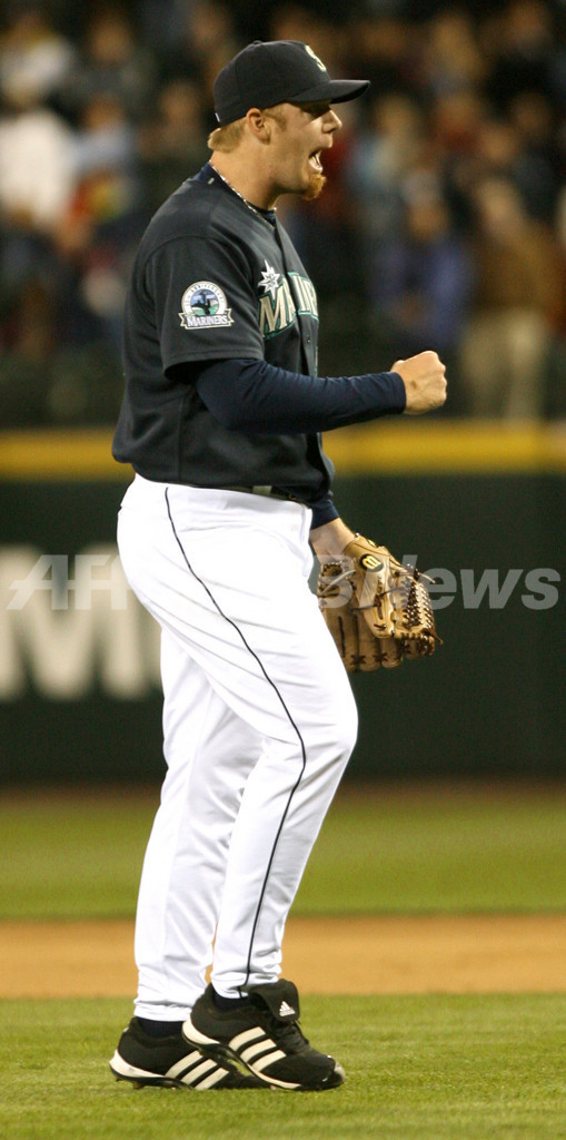 【ワシントンDC/米国 11日 AFP】07MLB、シアトル・マリナーズ(Seattle Mariners)vsニューヨーク・ヤンキース(New York Yankees)。9回から登板したマリナーズの守護神J・J・プッツ(J.J. Putz)は、1回を無安打無失点に抑えて今季8セーブ目を記録した。試合はマリナーズが3-0でヤンキースに勝利した。(c)AFP/Getty Images Otto Greule Jr