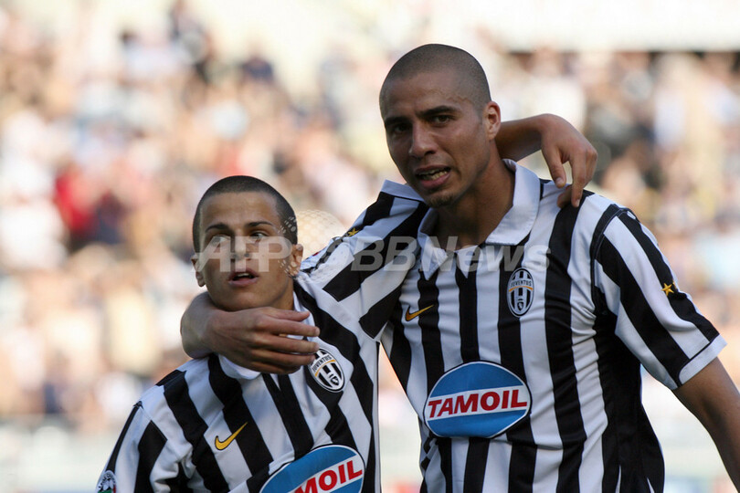 【トリノ/イタリア 12日 AFP】サッカー、イタリア・セリエB・第38節、ユベントス(Juventus)vsボローニャ(Bologna)。ユベントスのアレッサンドロ・デル・ピエロ(Alessandro Del Piero)は、2得点(前半37分、後半41分)を挙げる活躍でチームの勝利に貢献した。試合はユベントスが3-1でボローニャを降し、リーグ26勝目を挙げ勝ち点を79に伸ばした。写真は、後半41にPKを決めチームメイトのセバスティアン・ジオビンコ(Sebastian Giovinco、右)から祝福を受けるデル・ピエロ。(c)AFP/GIUSEPPE CACACE