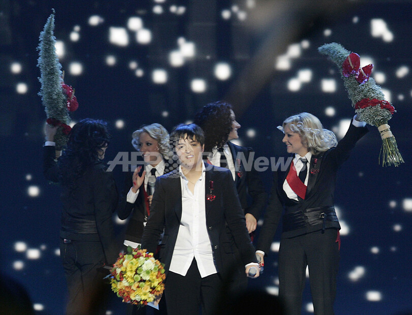 写真は、優勝を決め喜ぶMarija Serifovic。(c)AFP/LEHTIKUVA/Sari Gustafsson