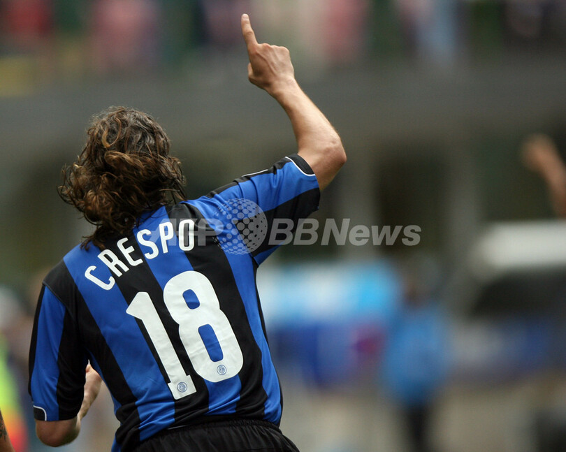 【ミラノ/イタリア 13日 AFP】サッカー、イタリア・セリエA・第36節、インテル(Inter Milan)vsラツィオ(SS Lazio)。試合はエルナン・クレスポ(Hernan Crespo)がハットトリック(前半20分、同35分、後半36分)を達成する活躍を見せたインテルが4-3でラツィオを降し、シーズン29勝目を挙げて勝ち点を93に伸ばした。写真は、クレスポ(中央)を祝福するインテルの選手。(c)AFP/GIUSEPPE CACACE